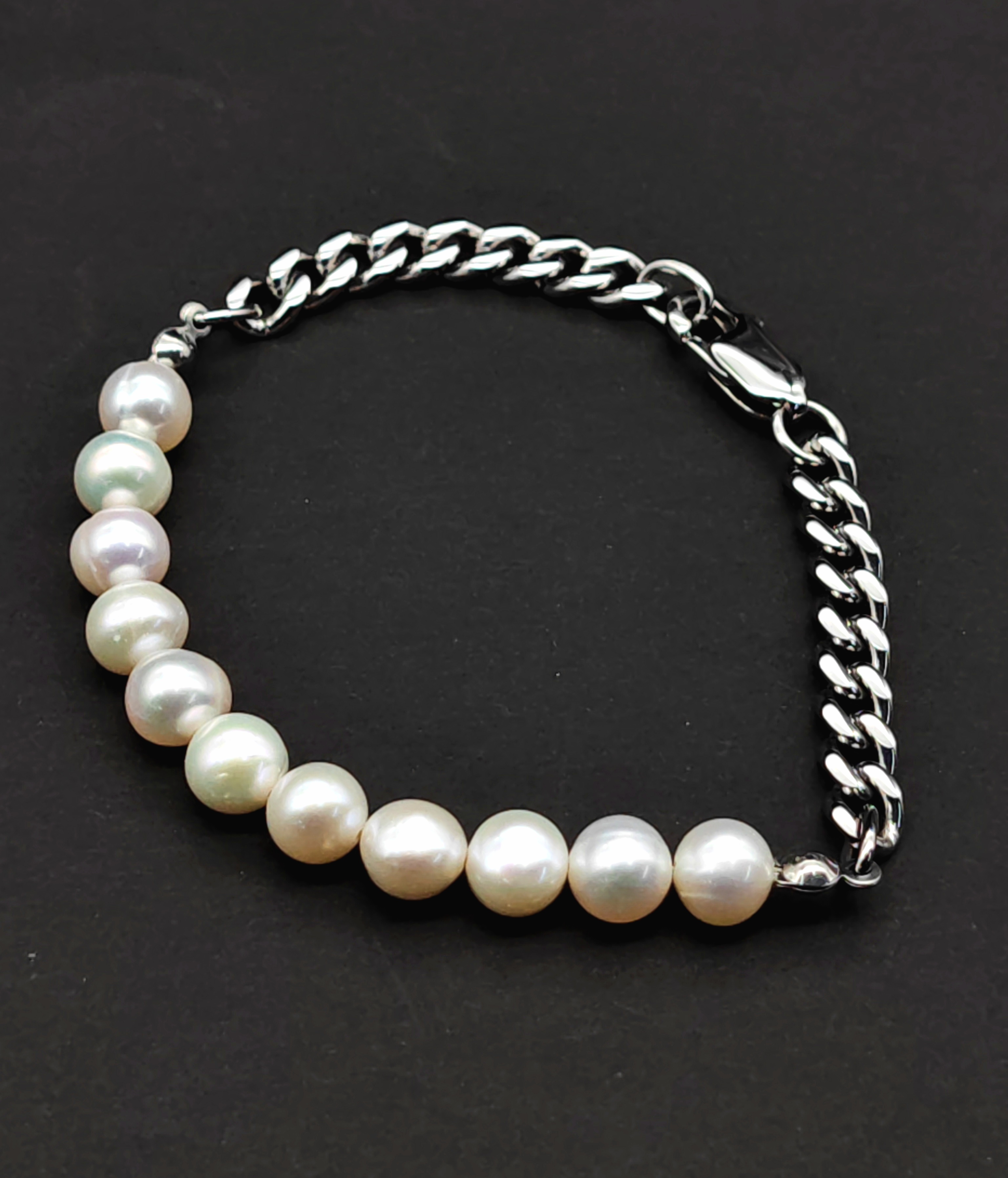 6mm白珍珠串拼鋼色古巴鏈手鏈(B862S) 6mm White Pearl with Steel Polish Cuban Chain Bracelet