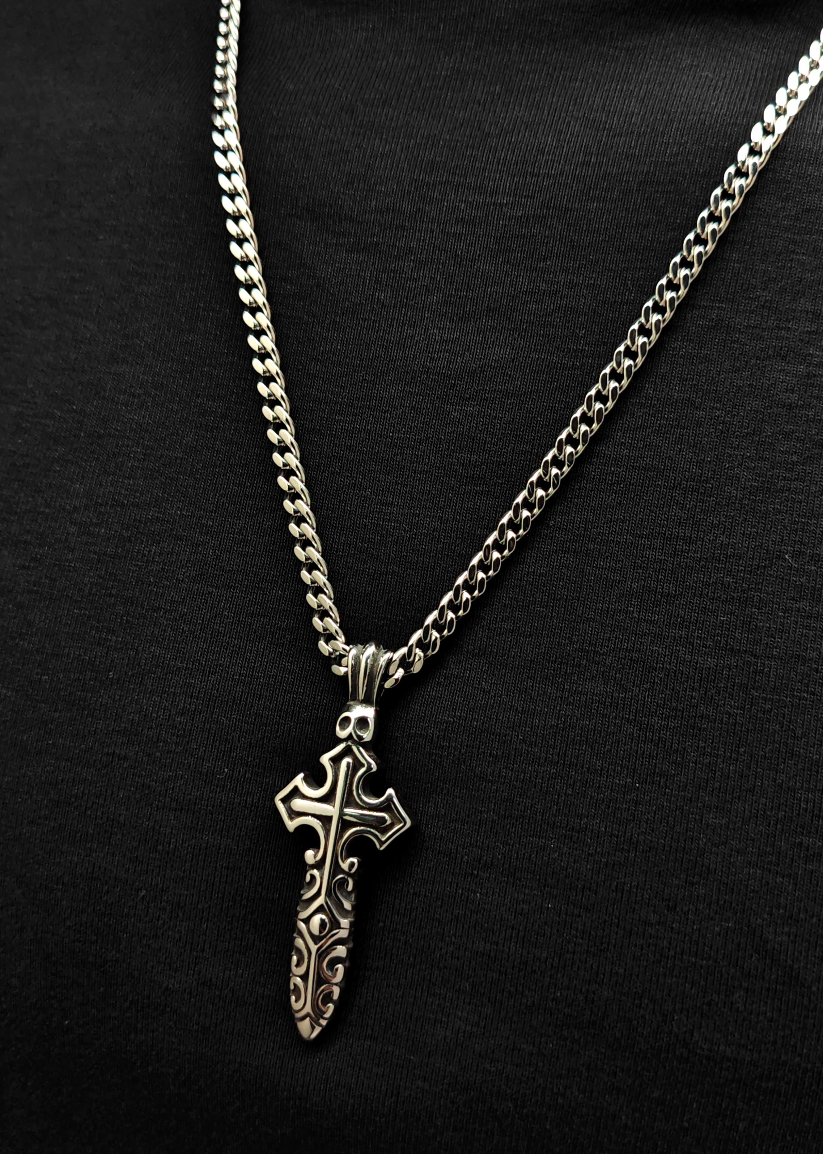 不銹鋼復古黑24mm匕首型十字架吊咀頸鏈(N857S)Stainless Steel Antique Black Silver 24mm Dragger Cross Necklace