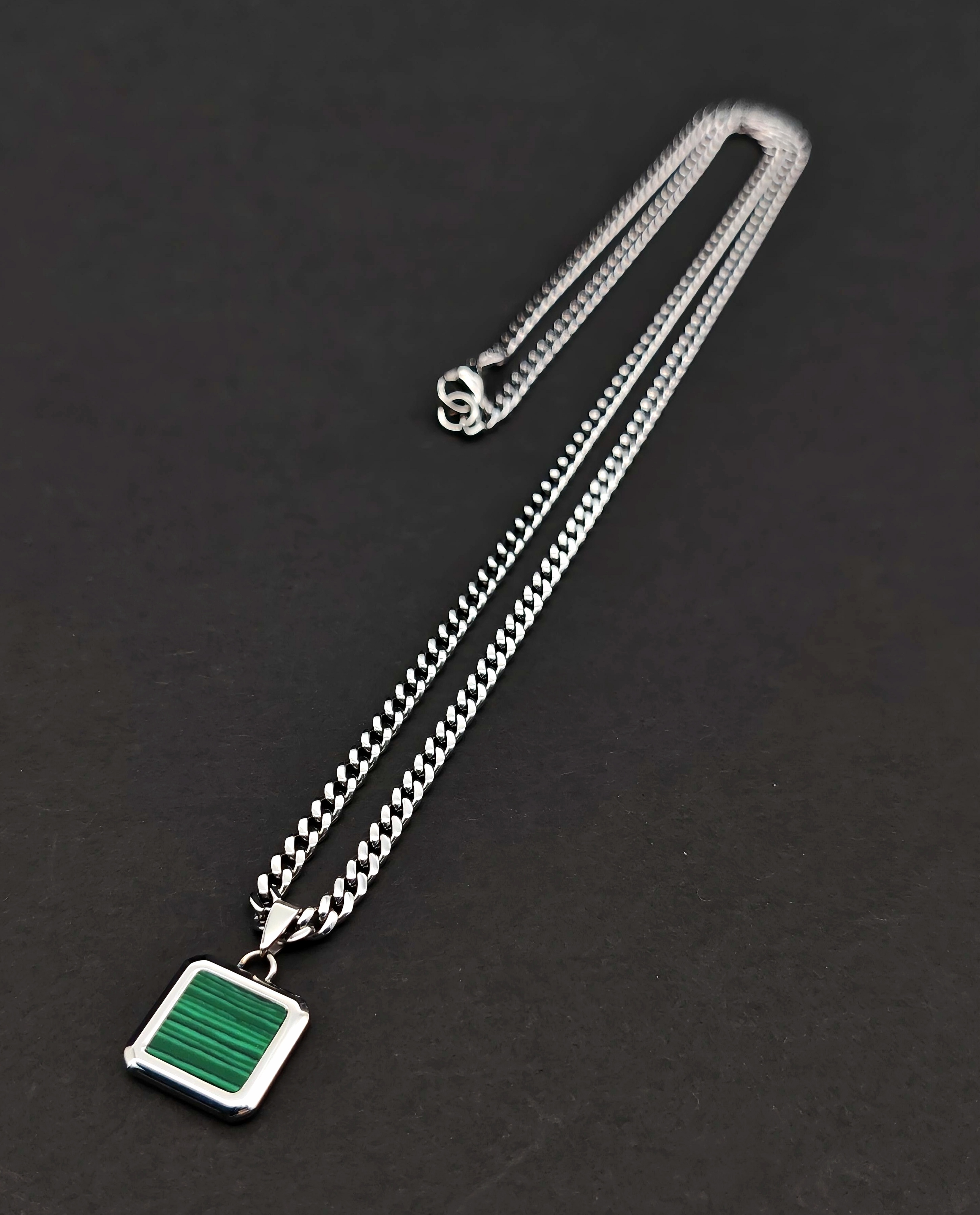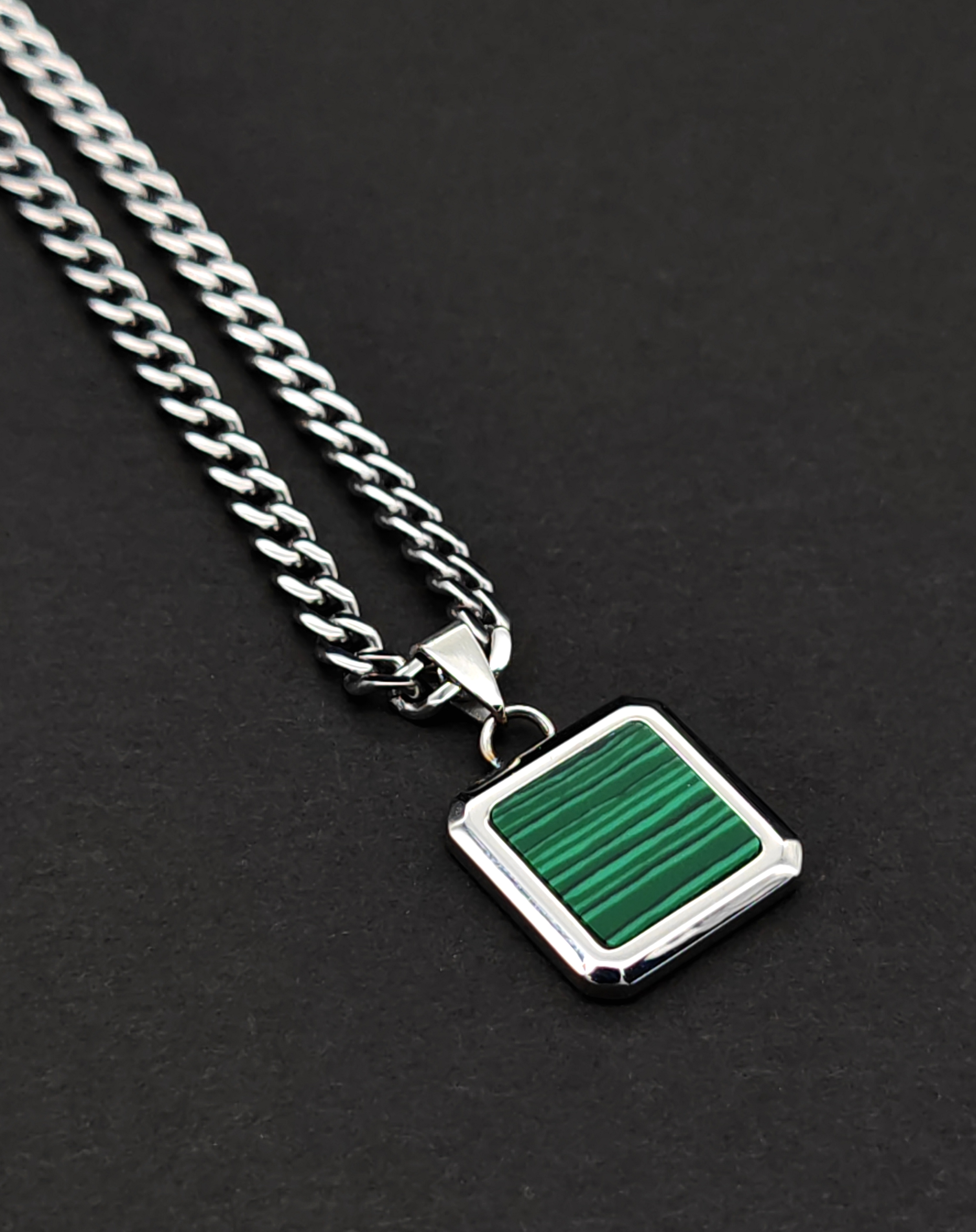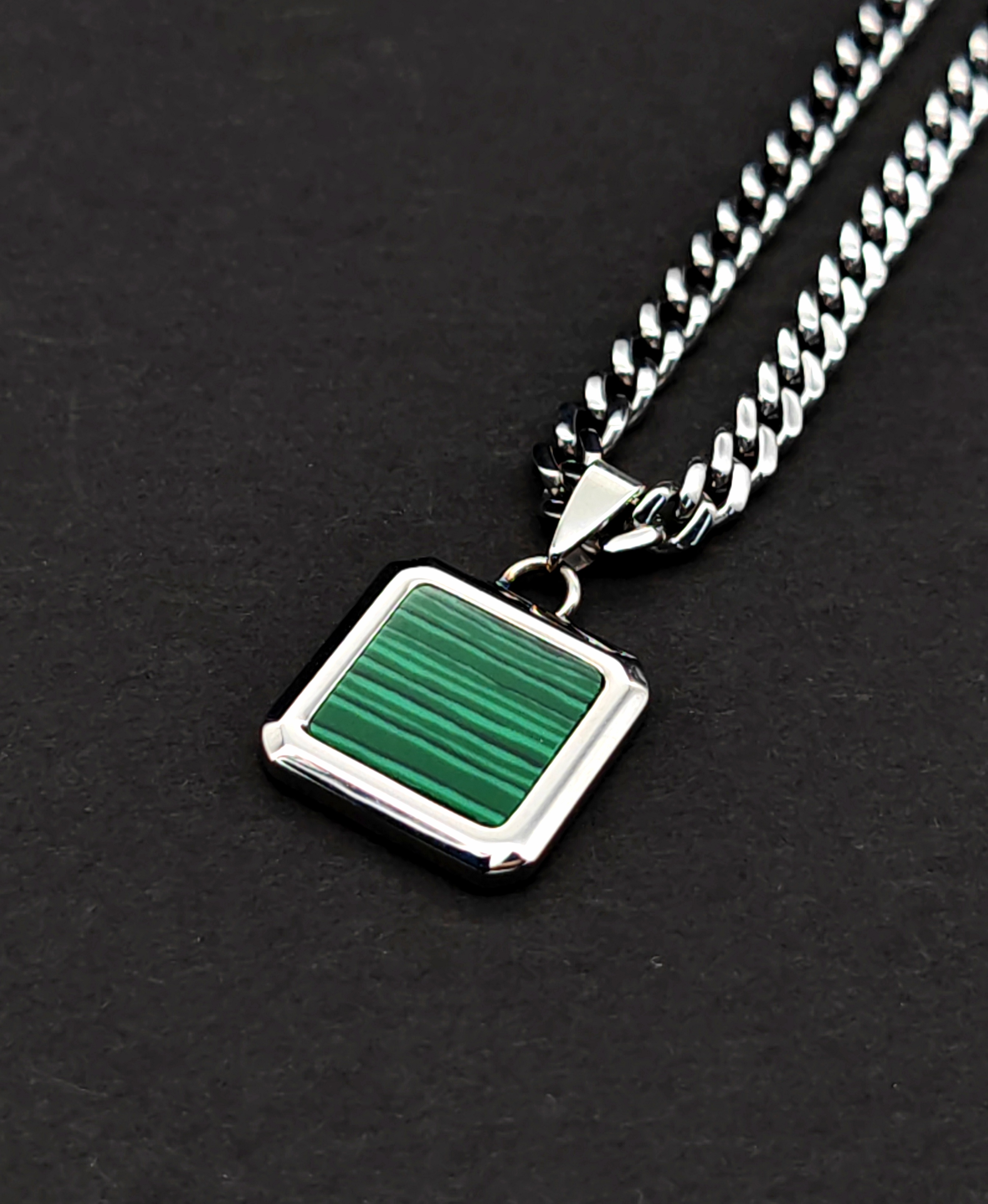 14mm孔雀綠石方型鋼色吊咀頸鏈(STL-N607) 14mm Steel Square Pendant with Malachite
