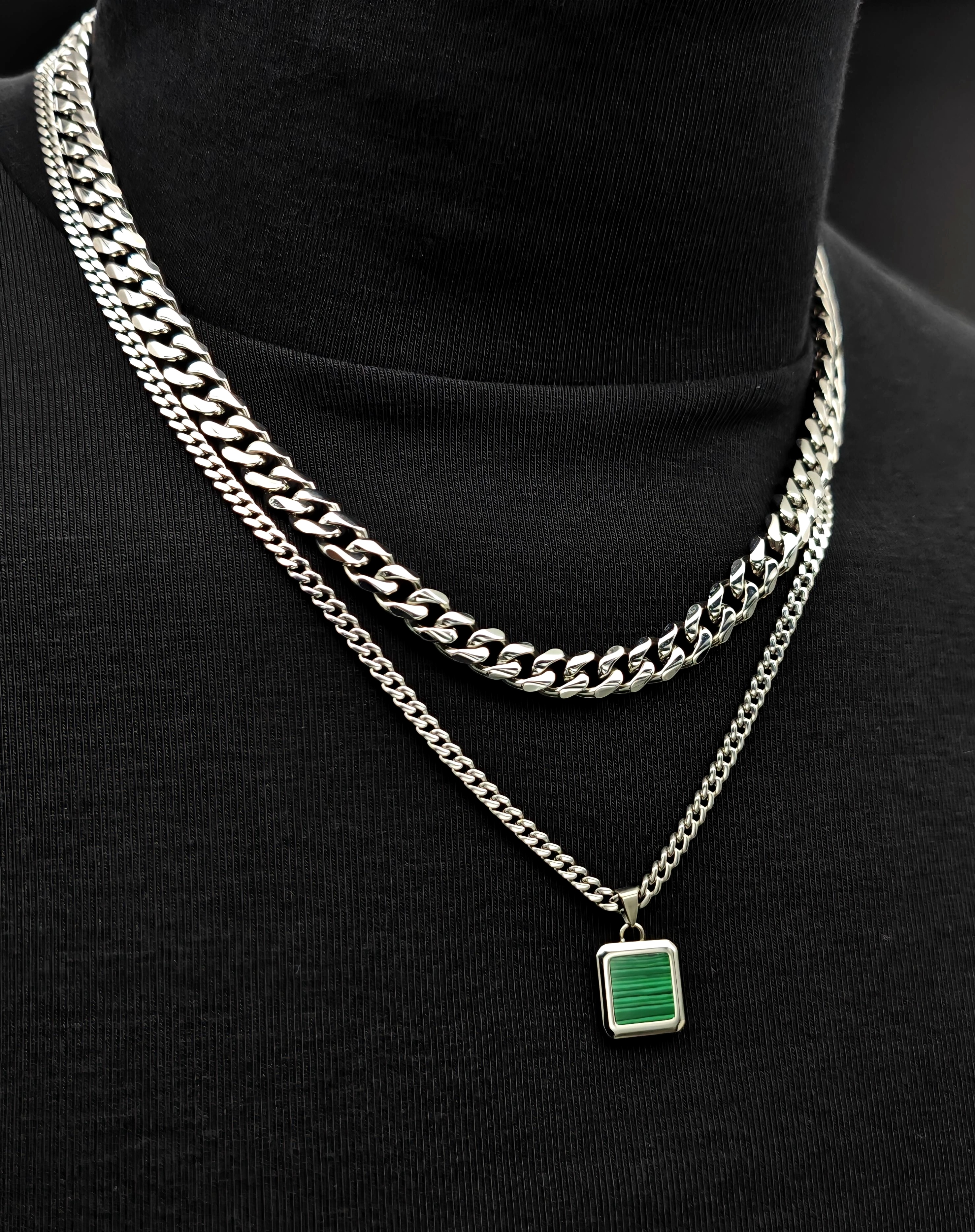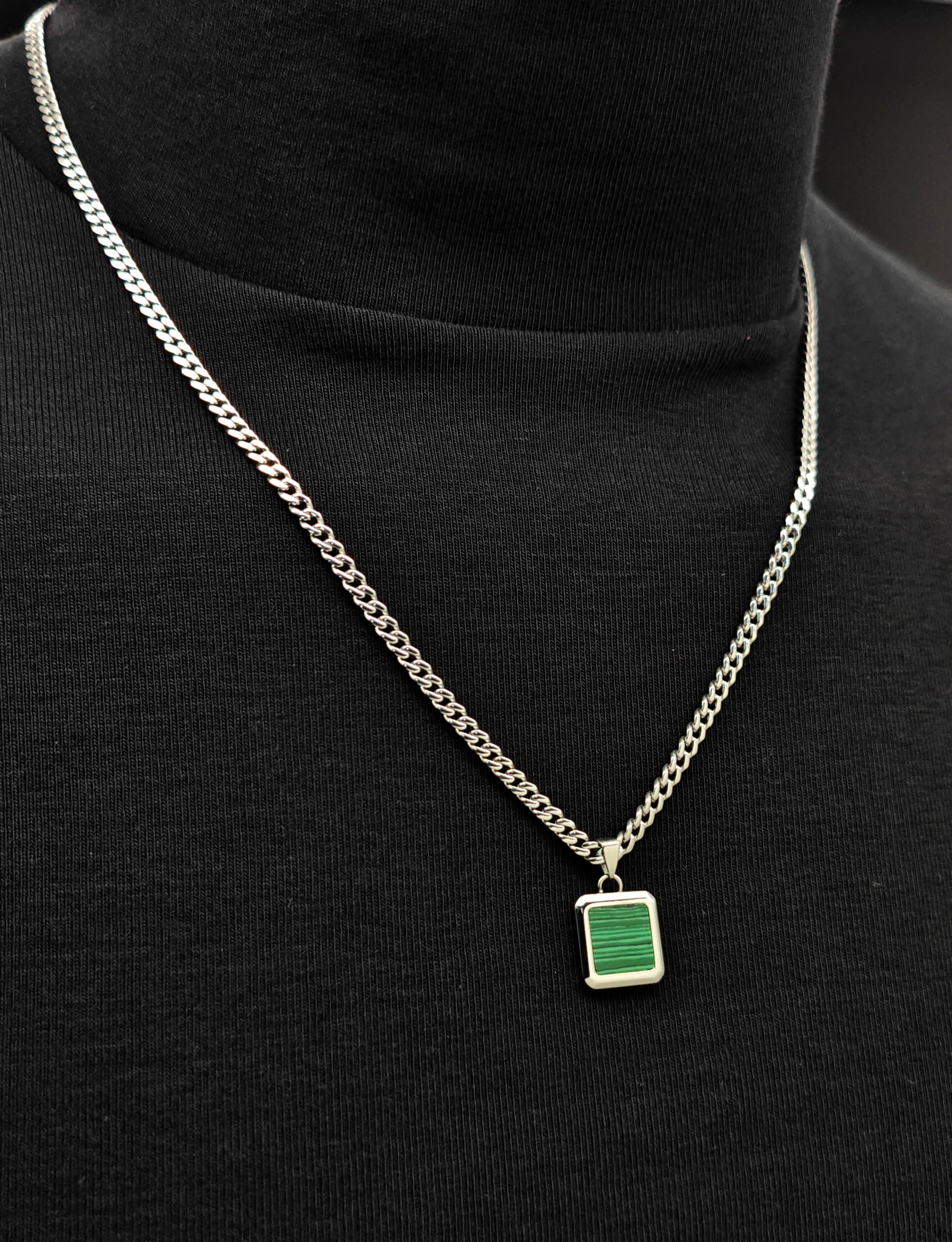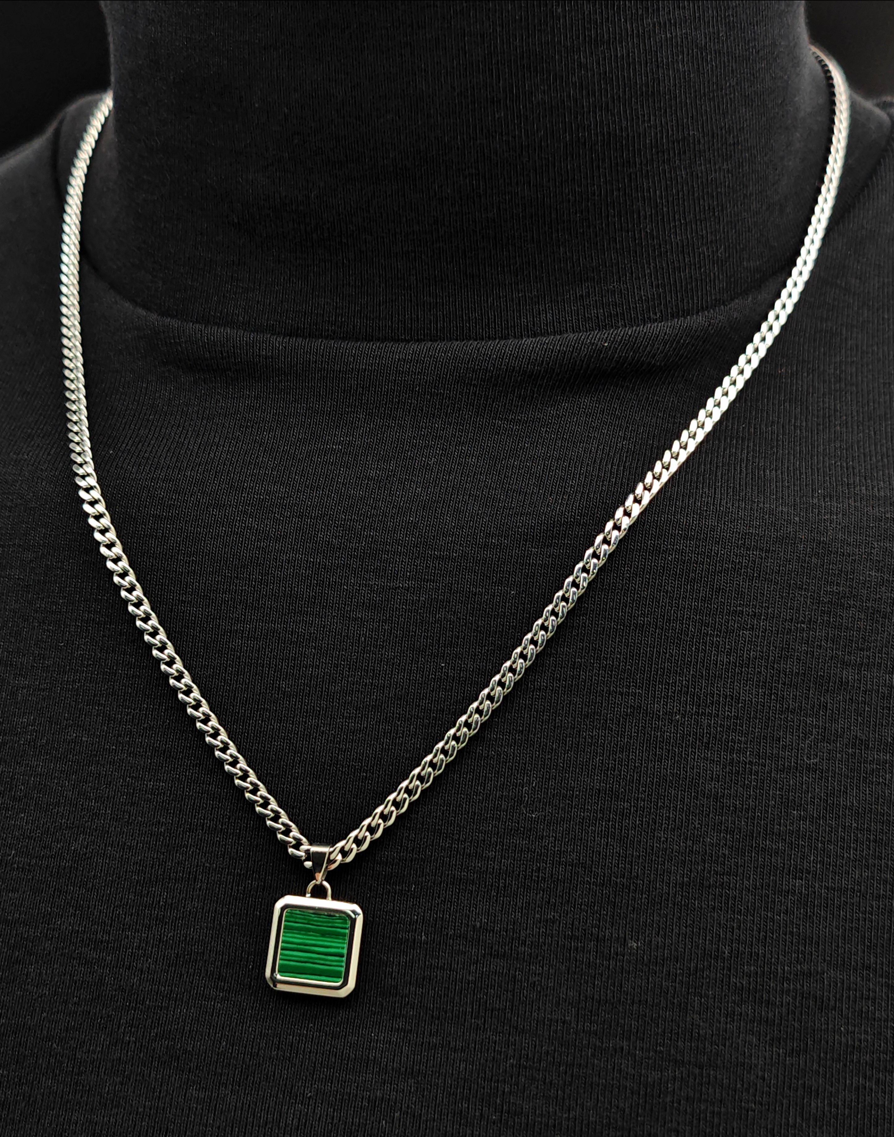 14mm孔雀綠石方型鋼色吊咀頸鏈(STL-N607) 14mm Steel Square Pendant with Malachite